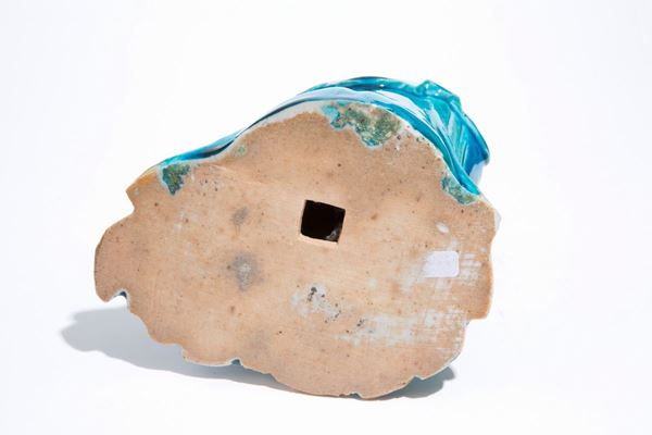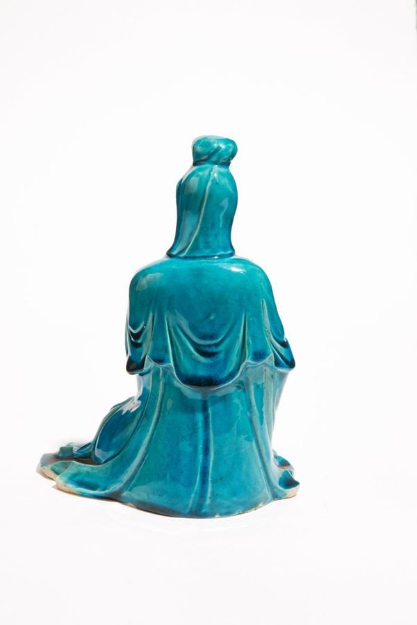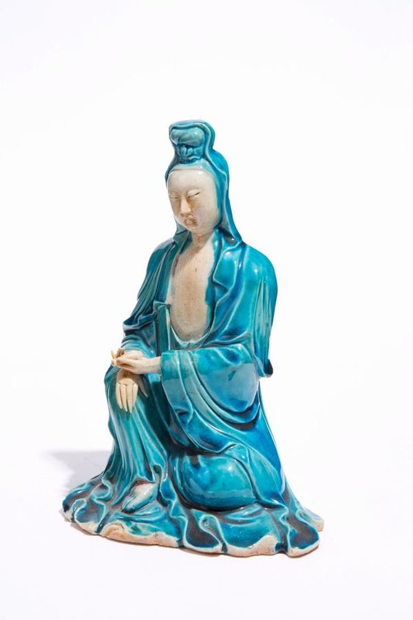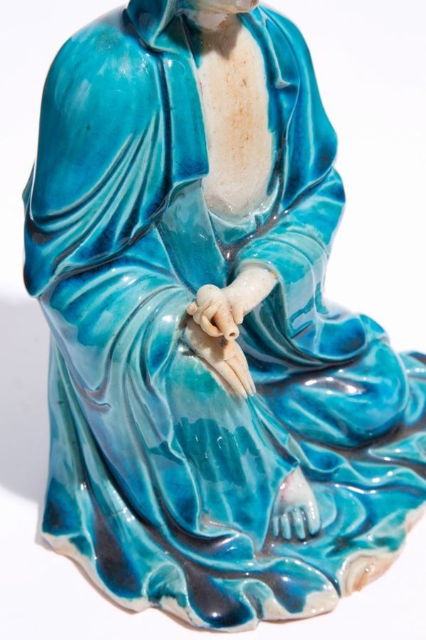 Statuetta in porcellana smaltata bianca e turchese. Cina.