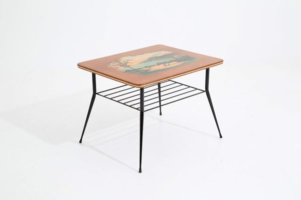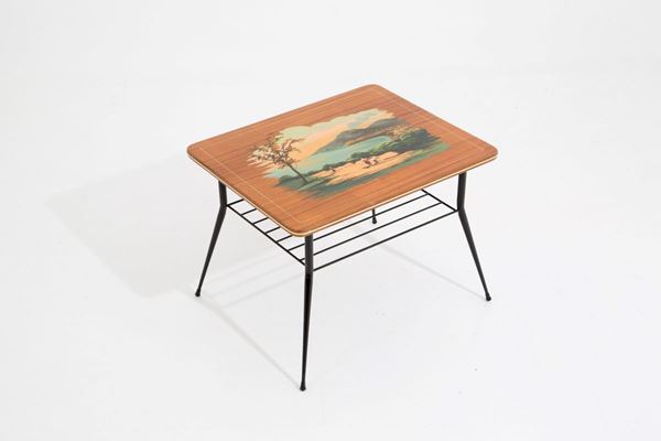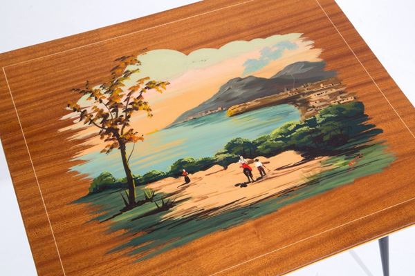 Tavolino in metallo con piano in legno laccato con dipinto raff. "GOLFO DI NAPOLI". Firma non identificata in basso a destra. Anni '60.