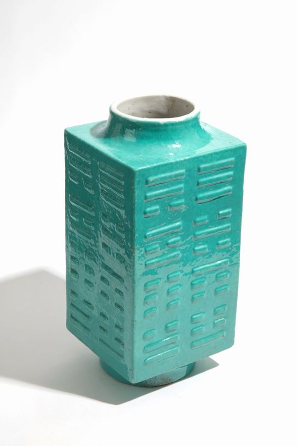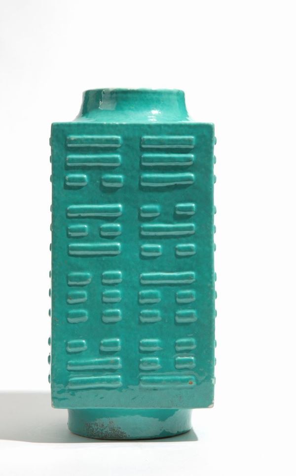 Vaso in porcellana turchese di forma parallelepipeda con disegni geometrici a rilievo. Cina. Lievi difetti.