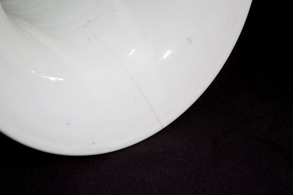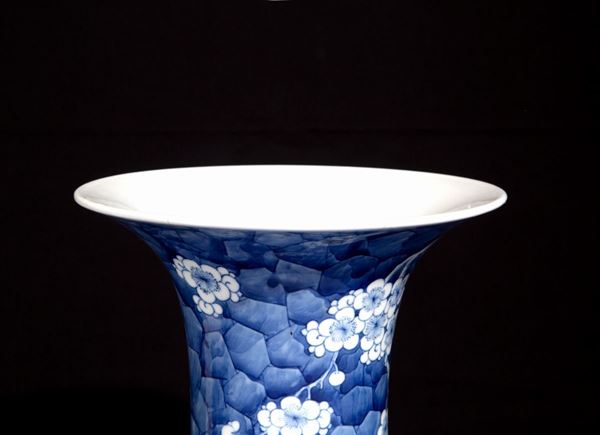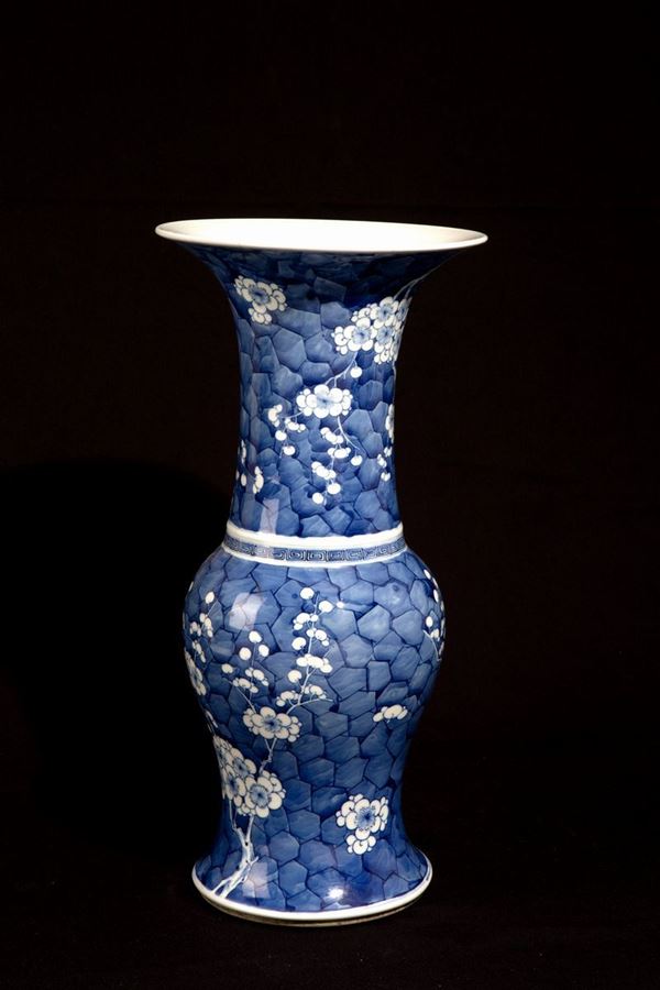 Vaso a tromba in porcellana bianca e blu raff. "FIORI DI CILIEGIO". Marcato sul fondo. Cina. Difetti.