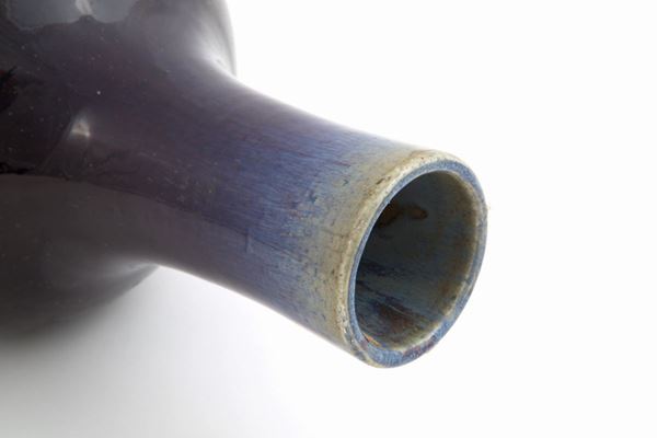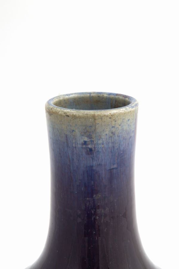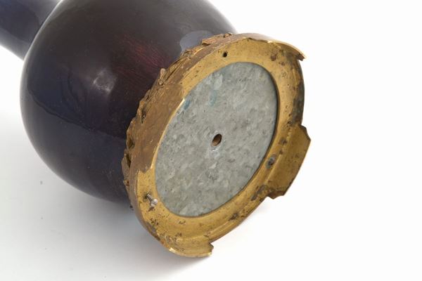 Vaso in porcellana color melanzana. Base in bronzo dorato. Cina. Difetti.