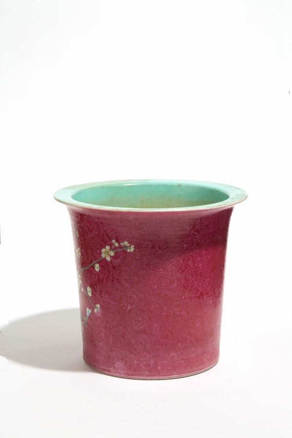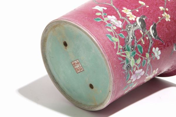 Vaso in porcellana dipinta con incisioni raff. "RAMO FIORITO E UCCELLI". Marcato sul fondo. Cina.