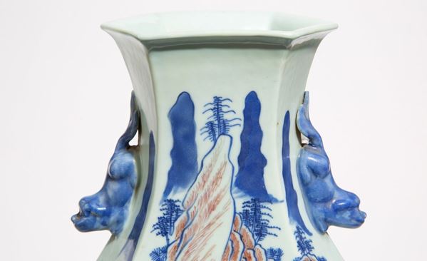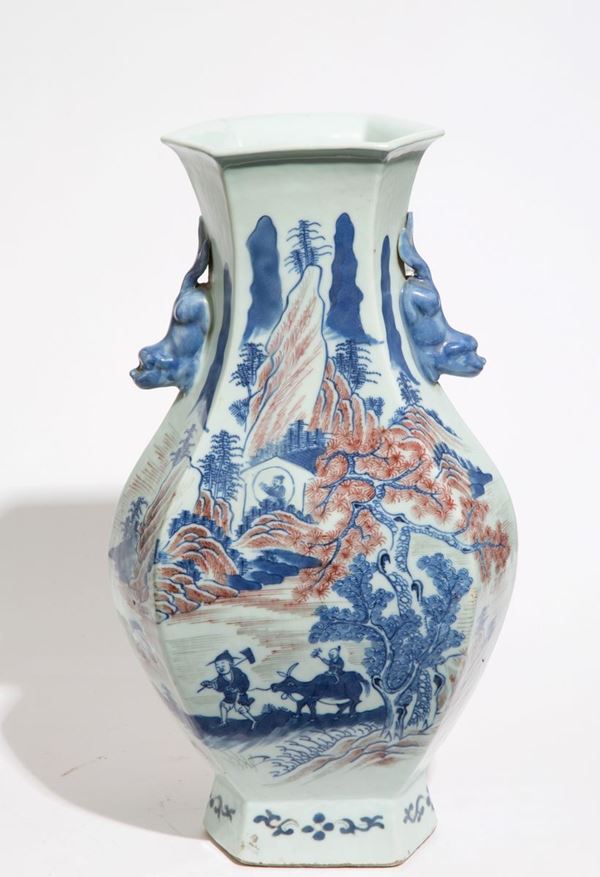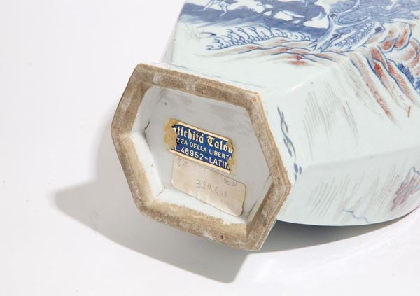 Vaso a forma esagonale in porcellana dipinta raff. "PAESAGGIO ANIMATO" con anse a cani di fo. Cina.
