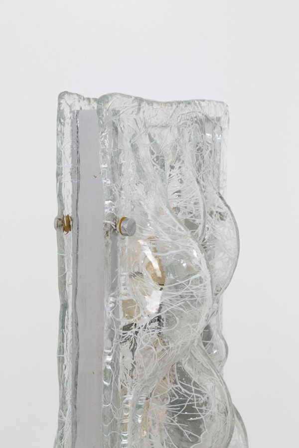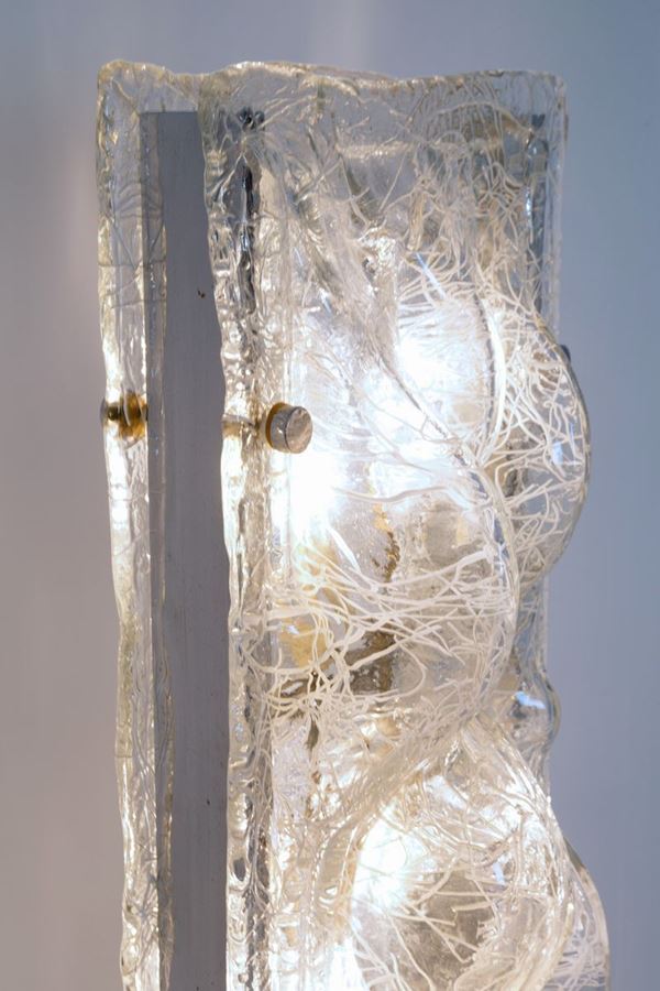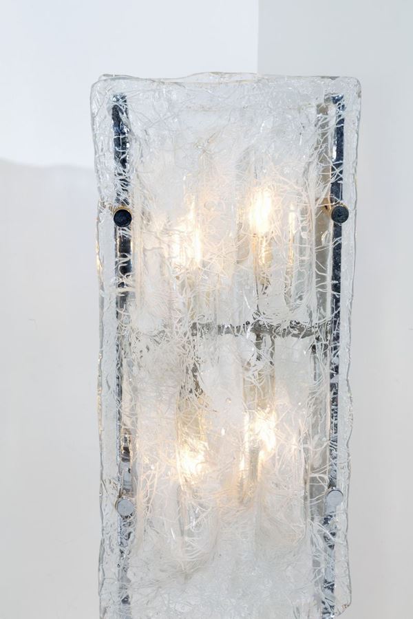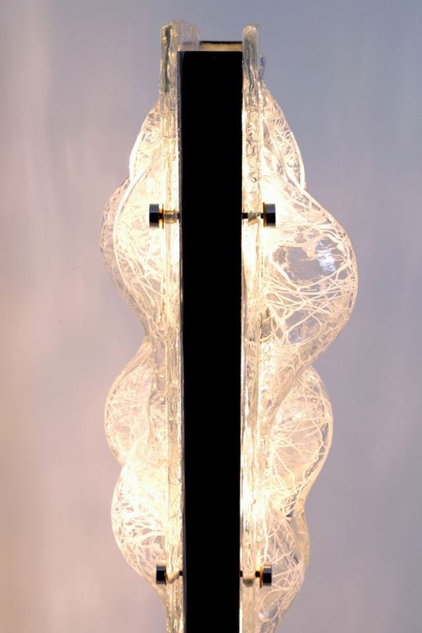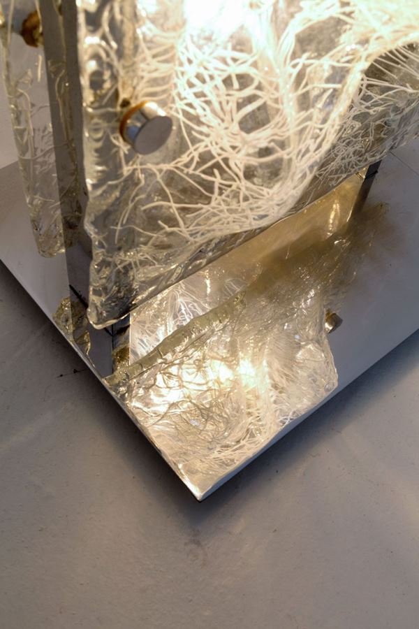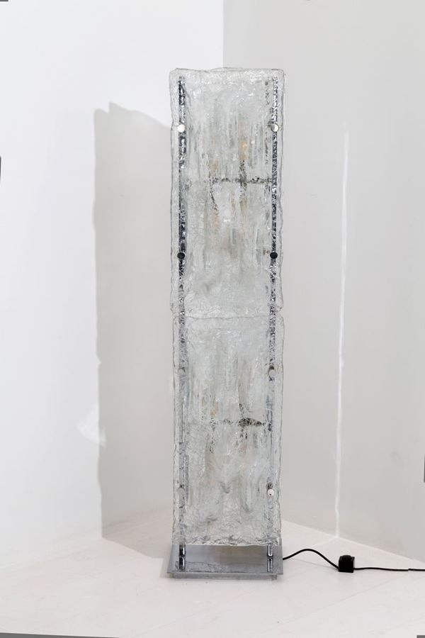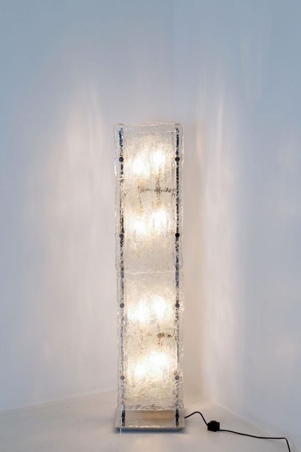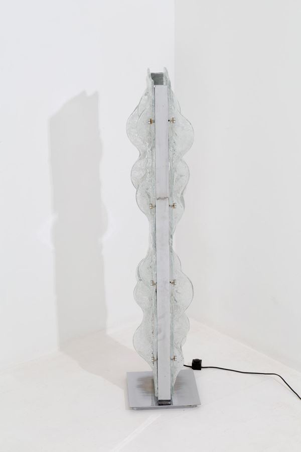 Lampada da terra in metallo cromato con quattro piastre in vetro e filamenti in vetro bianco. Produzione MAZZEGA. Anni '70.