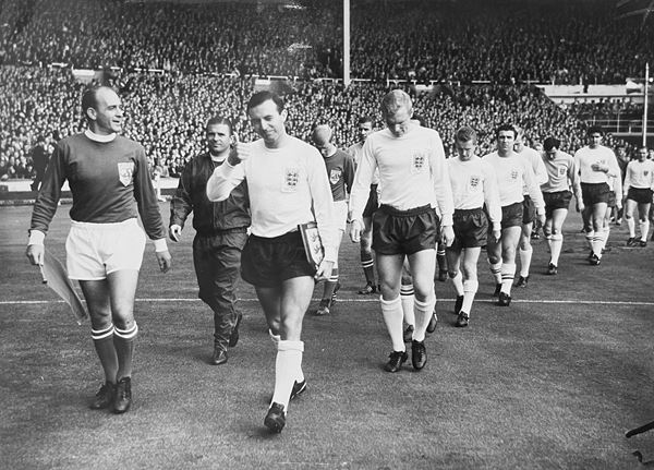 - Inghilterra-resto del Mondo, Stadio Wembley. Partita celebrativa del centenario del Football Association, 23 ottobre 1963. In primo piano i capitani Alfredo Di Stefano a sinistra e Jimmy Armfield a destra.