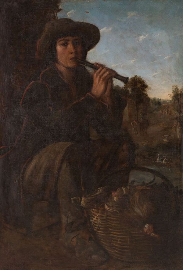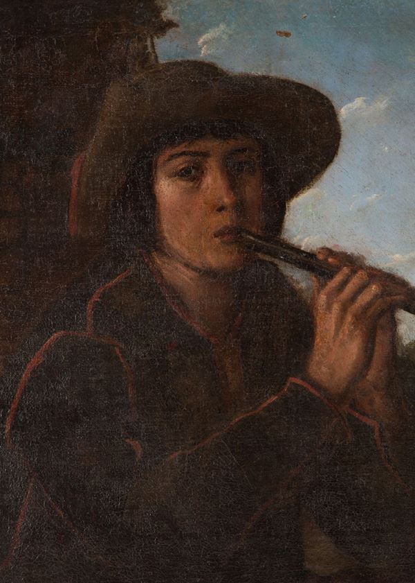 PITTORE BAMBOCCIANTE DEL XVII SECOLO. Dipinto olio su tela raff. "IL PIFFERAIO". In cornice.