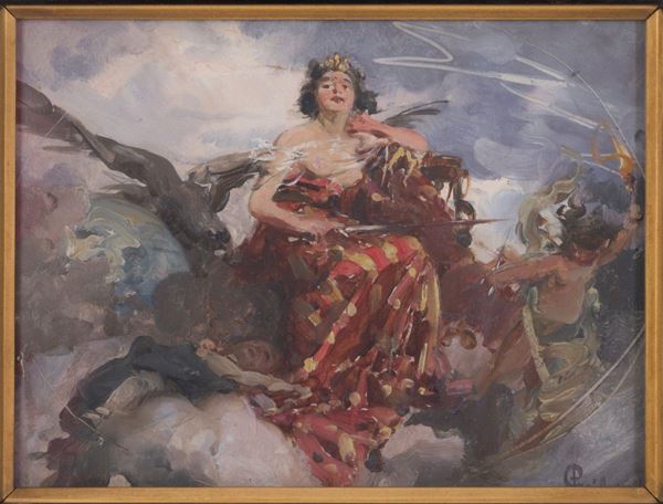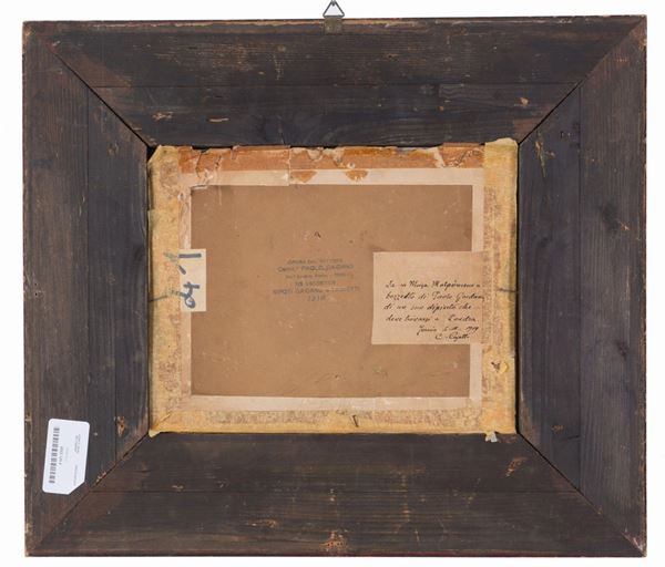 Dipinto olio su tavoletta raffigurante "MUSA MELPOMENE". Firmato in basso a destra. Reca descrizione sul retro "Bozzetto di Paolo Gaidano di un suo dipinto che deve trovarsi a Londra. Fornio 4.III.1919". In cornice guilloché.