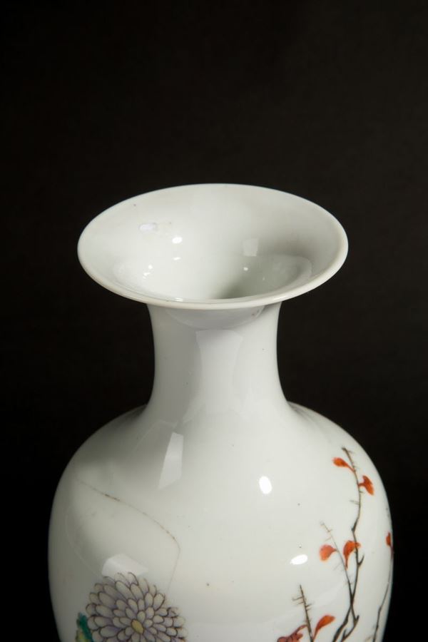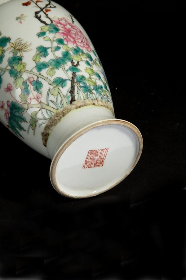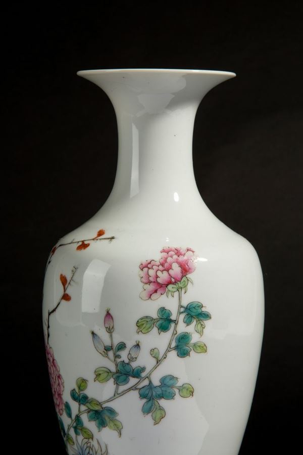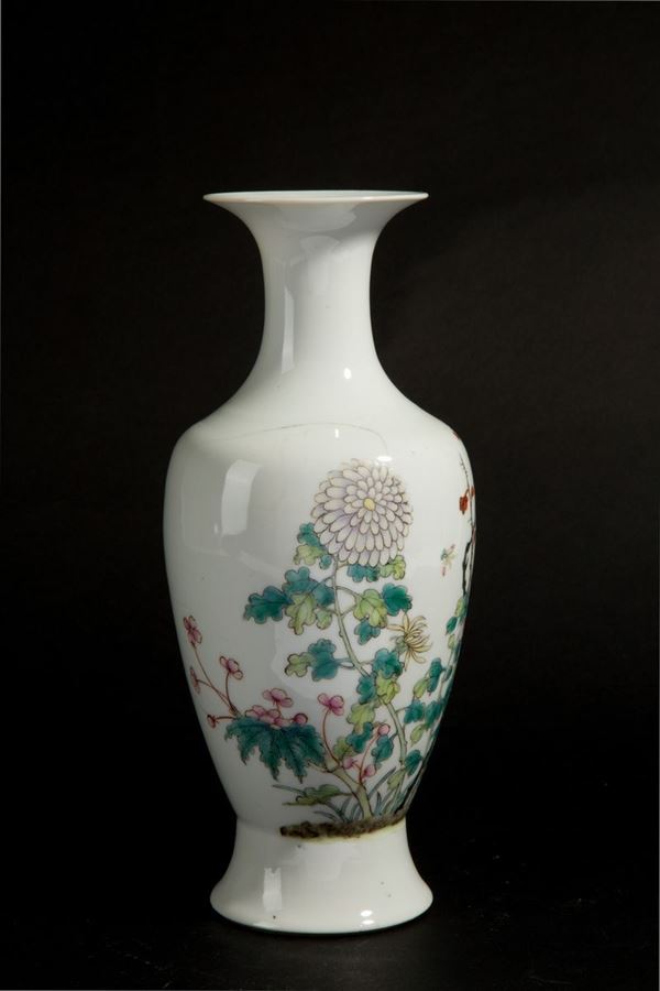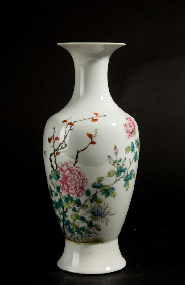 Piccolo vaso in porcellana decorato a motivi floreali. Marcato sul fondo. Cina. XIX secolo. Felatura.