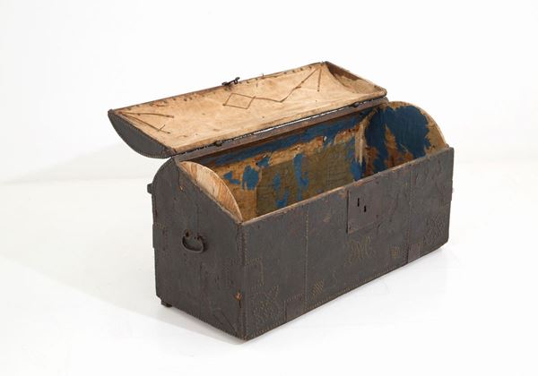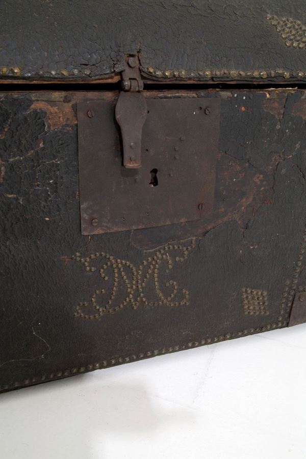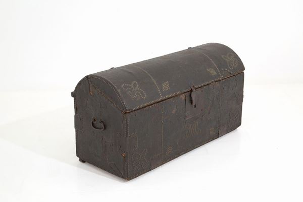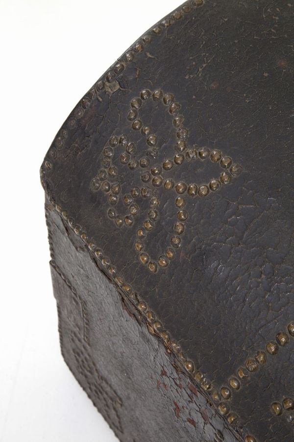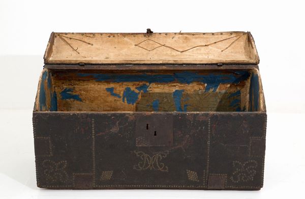 Baule in legno rivestito in cuoio con borchie. XVII secolo.