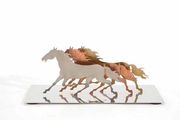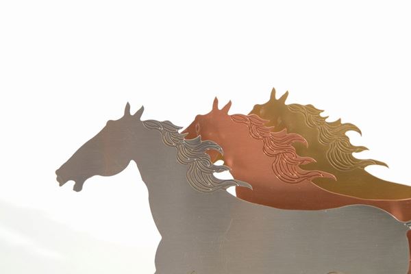 Multiplo in ottone dorato raffigurante "CAVALLI IN CORSA". Firmato in basso a destra. 1992. Tiratura non indicata.