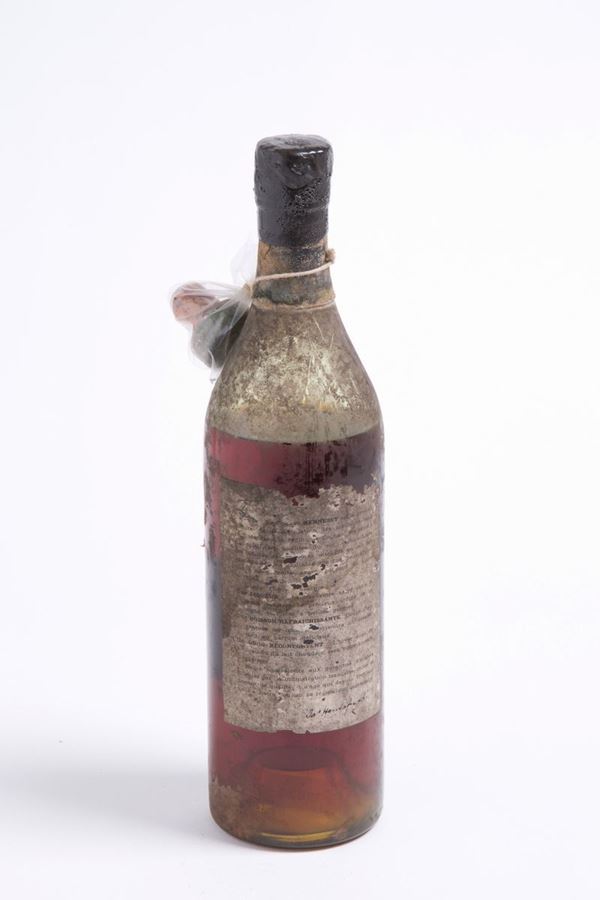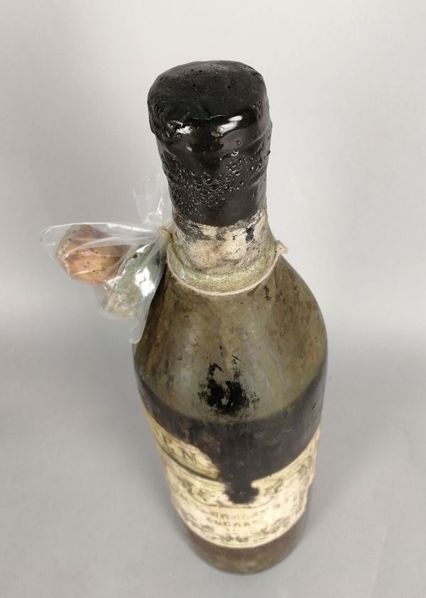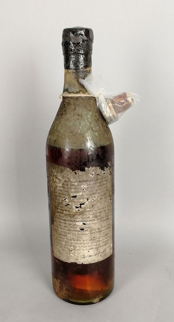 Cognac JAMES HENNESSY (nipote del fondatore della casa). Bottiglia anni '20-'30. Tappo sigillato in ceralacca e tappo originale allegato. Indicazione in rosso della gradazione alcolica, 42°. Livello inizio spalla.