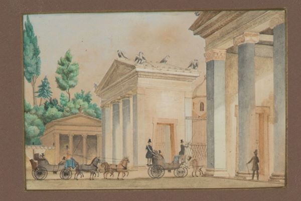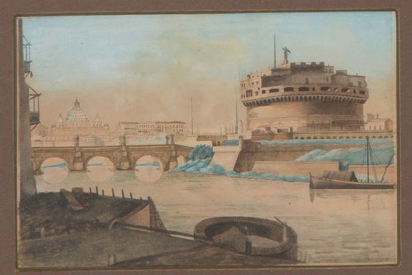 Coppia di acquarelli raffiguranti "CASTEL SANT'ANGELO" e "PORTA PINCIANA". XIX secolo. In cornici antiche coeve.