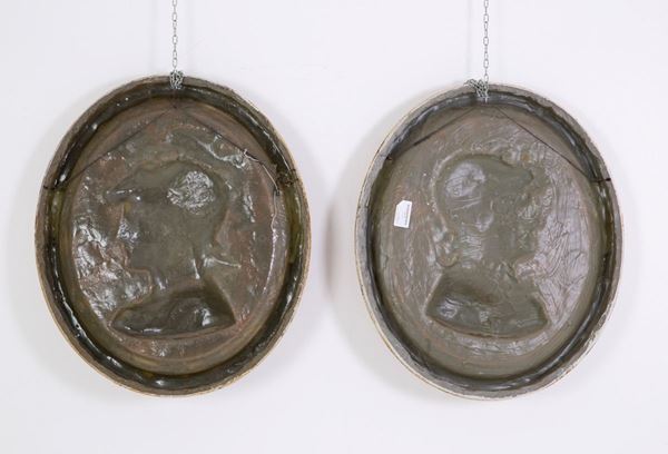 Coppia di medaglioni ovali in resina dipinta a finto bronzo dorato e marmo raffiguranti "PROFILI DI GUERRIERI". XX secolo.