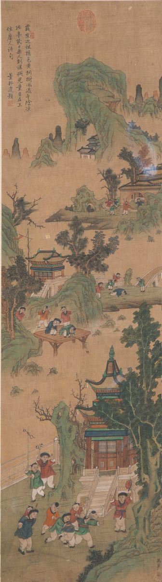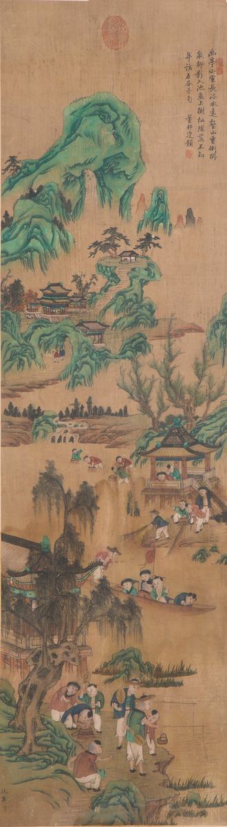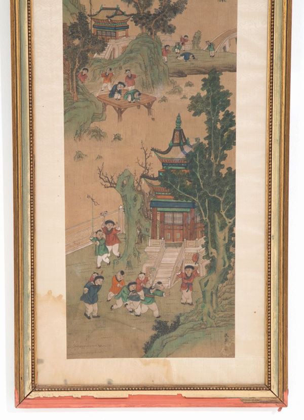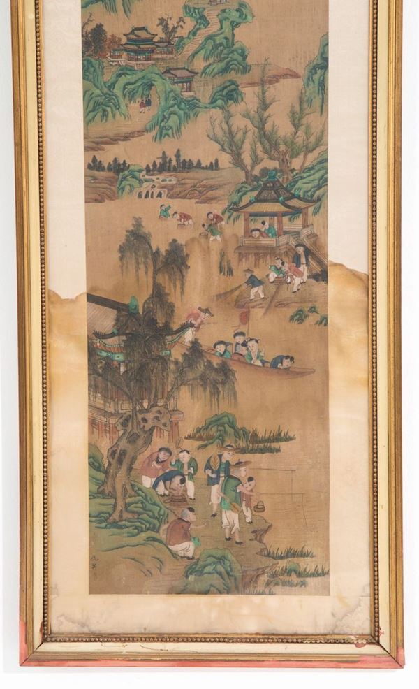 Coppia di pannelli in seta dipinta raffiguranti "PAESAGGIO ANIMATO". Con scritte e timbri nella parte superiore. Cina. In cornice. Difetto.