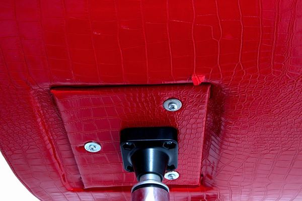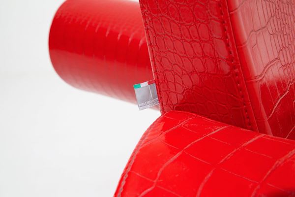 Coppia di poltrone in pelle rossa e acciaio. Produzione PALLADIUM DESIGN.