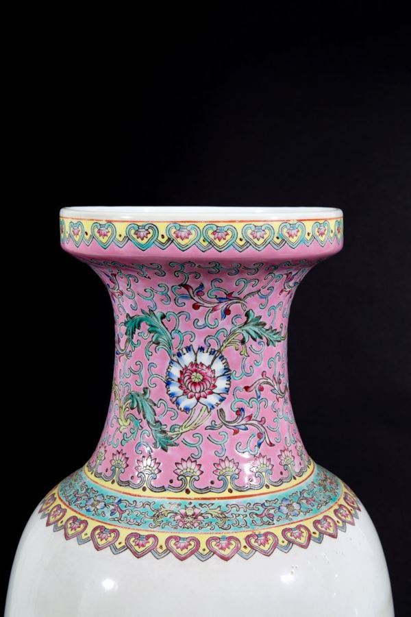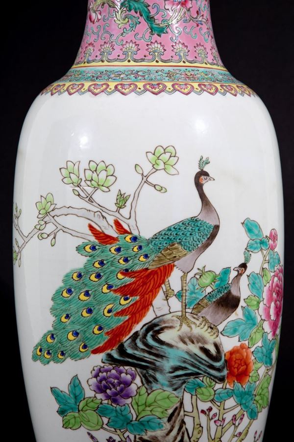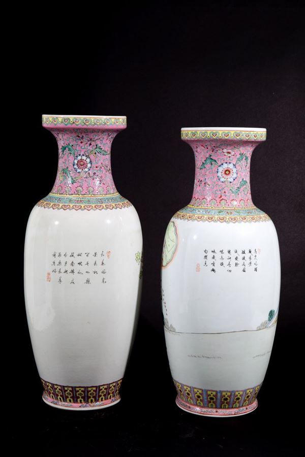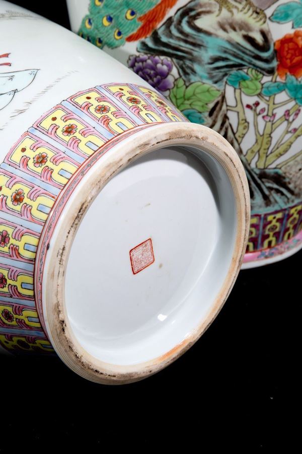 Coppia di vasi in porcellana Famiglia Rosa raffiguranti "GUANYN E ANIMALI". Marcati sul fondo. Cina.