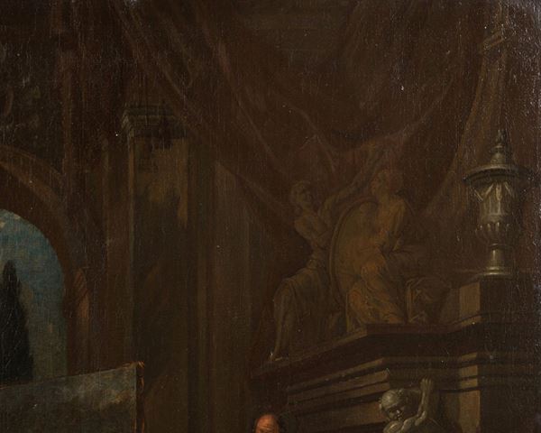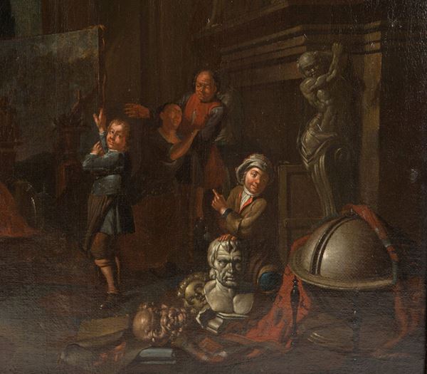 SCUOLA FIAMMINGA DEL XVII SECOLO. Dipinto olio su tela raffigurante "ATELIER DI UN MERCANTE D'ARTE". In cornice non coeva nera ed oro. Già rintelato e rintelaiato.