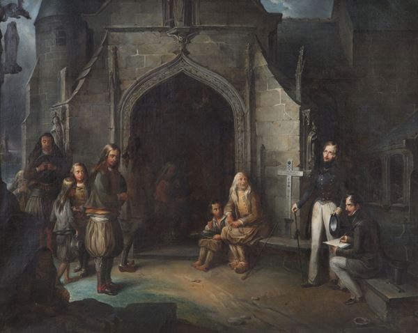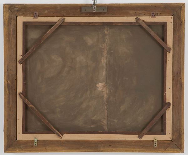 Dipinto olio su tela raffigurante "SCENA NOTTURNA CON FIGURE". XIX secolo. In cornice dorata. Restauri.