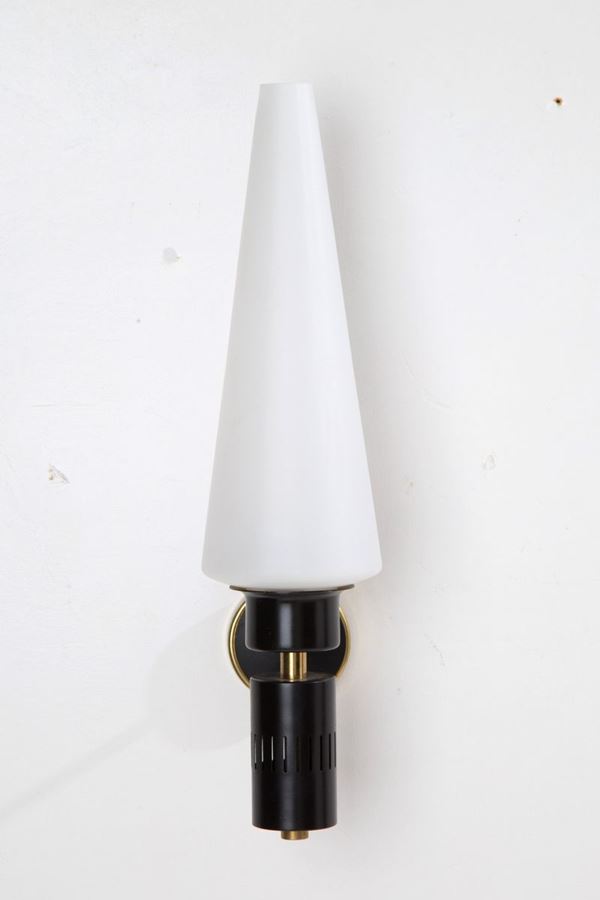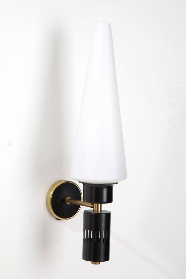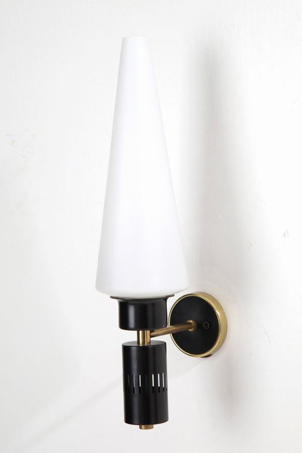 Coppia di applique in metallo verniciato nero con parti in ottone. Paralume a forma di cono in vetro lattimo. Anni '50-'60.