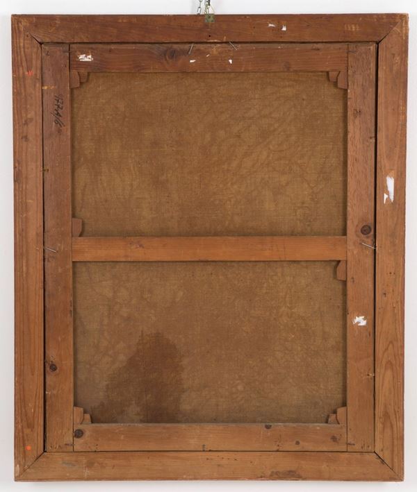 Dipinto olio su tela raffigurante "INTERNO DI CATTEDRALE CON ACQUASANTIERA E PERSONAGGI". Firmato in basso a destra. In cornice dorata.