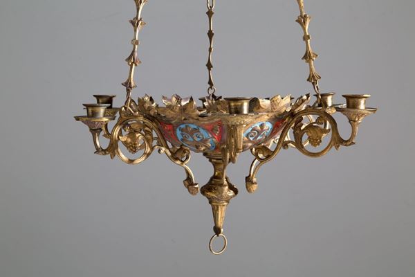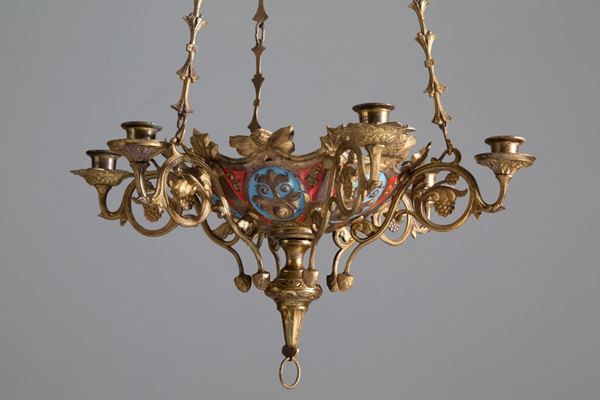 Lampadario a sei luci in bronzo dorato dipinto in rosso e azzurro. XIX secolo.