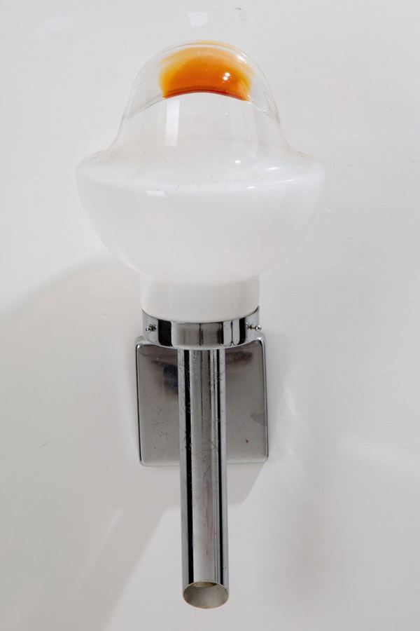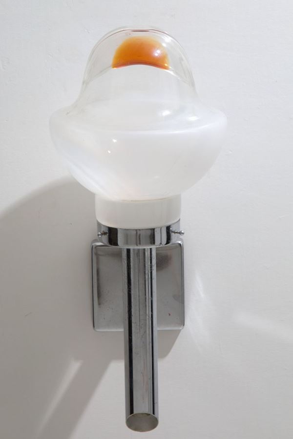 Coppia di applique due luci in metallo cromato e vetro lattimo. Anni '70.