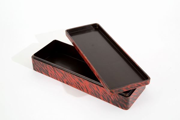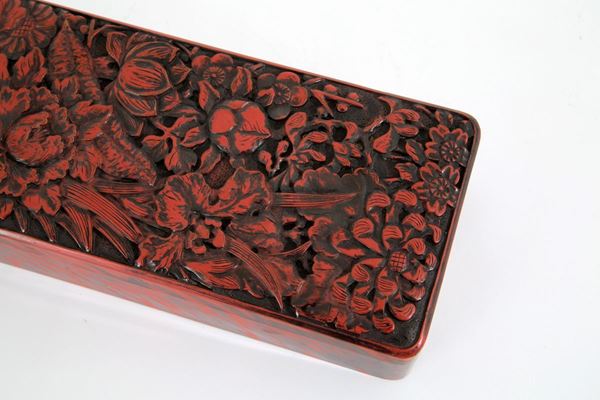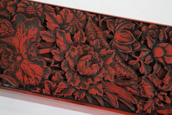 Scatola in legno laccato scolpita a motivi floreali. Cina.