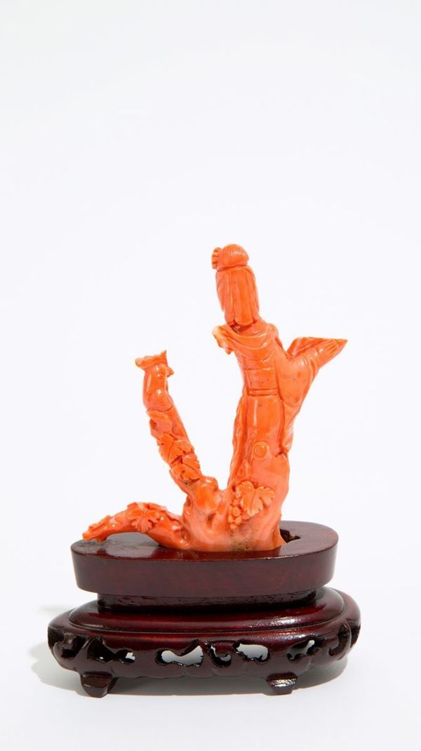 Scultura in corallo rosa raffigurante "GEISHA". Cina. XX secolo.