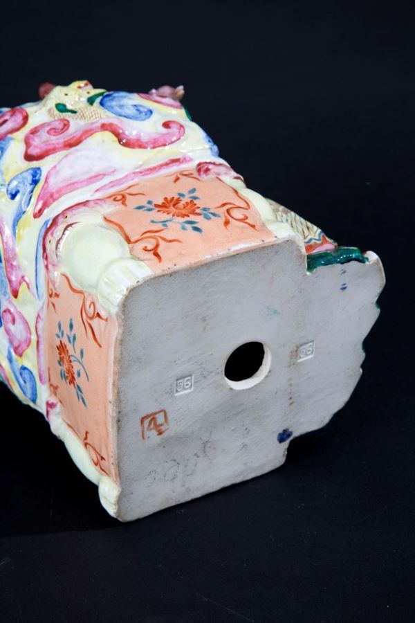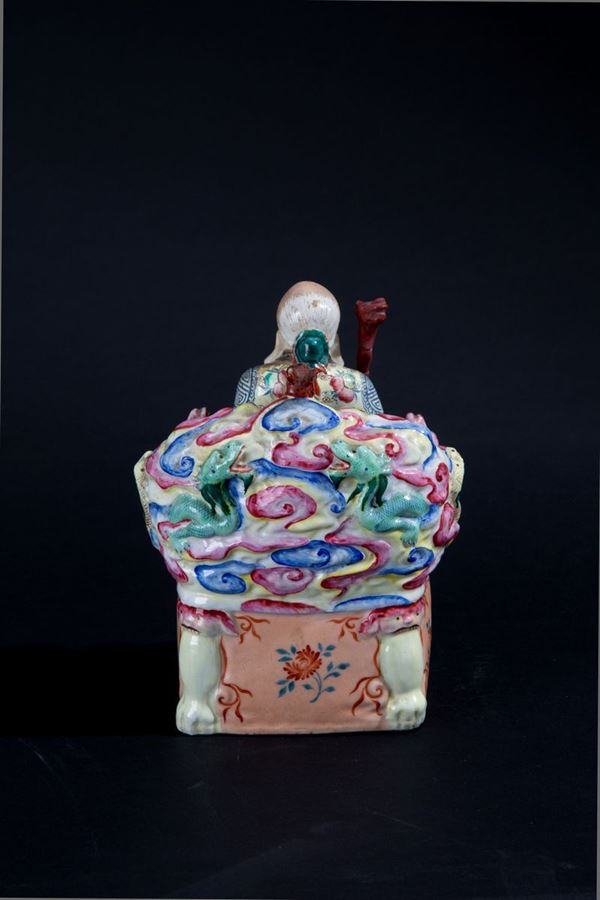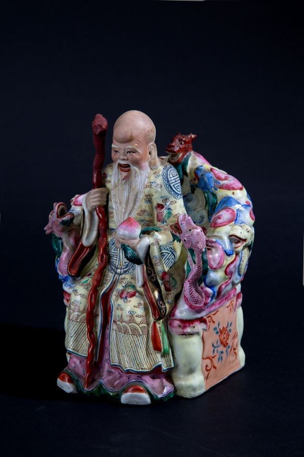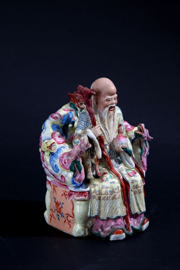 Scultura in porcellana policroma raffigurante "SANTONE SEDUTO SUL TRONO CON PESCA". Cina.