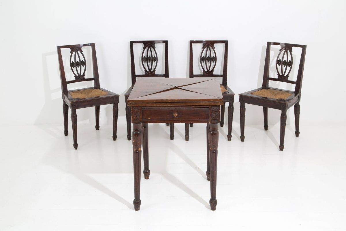 Tavolino da gioco in noce con piano apribile, cassetto sulla fascia e quattro sedie con cartella traforata a motivi floreli. Periodo Luigi XVI.