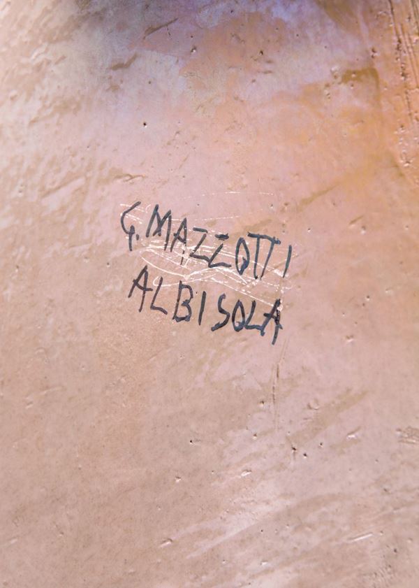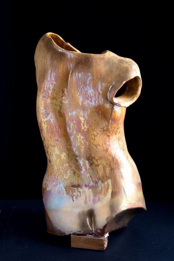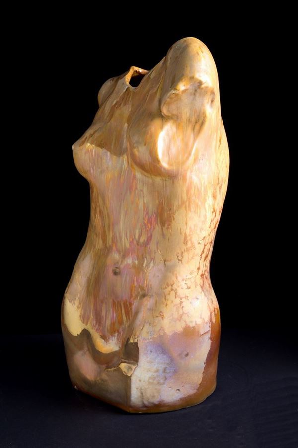 Vaso in terracotta invetriata a forma di torso femminile. Firmato G. Mazzotti Albissola sul fondo. Metà XX secolo.