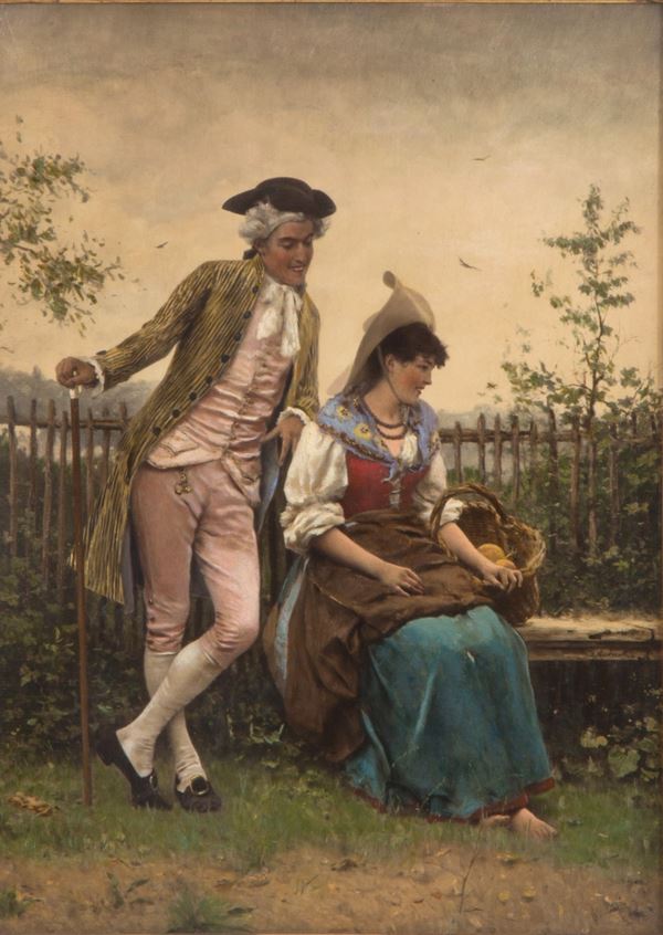 Dipinto olio su tavoletta raffigurante "SCENA GALANTE". Firmato al centro a destra. In cornice.