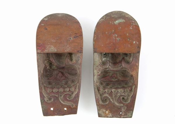 Antica coppia di sculture raffiguranti "BUDDHA" in rilievo su rame repousse parzialmente dorati. Cina - Tibet.