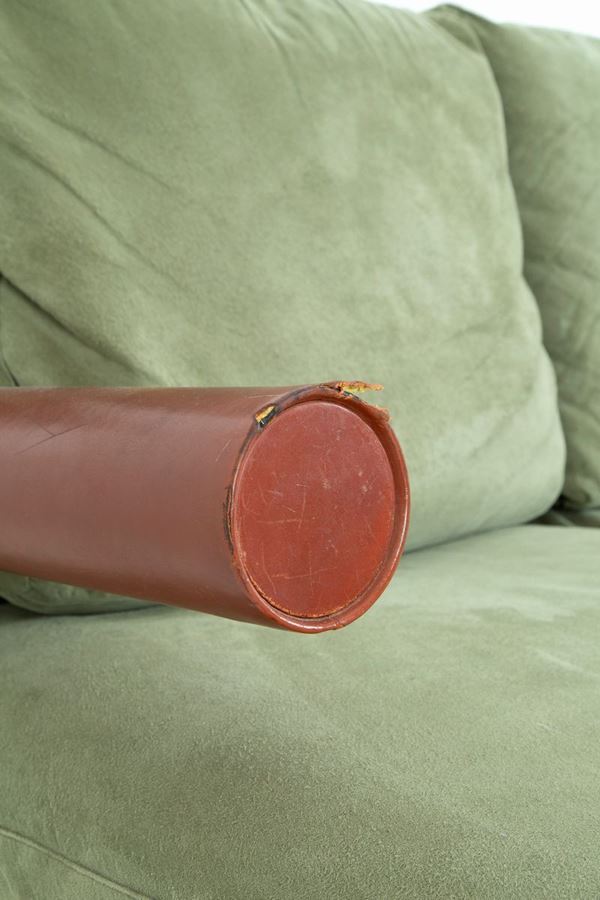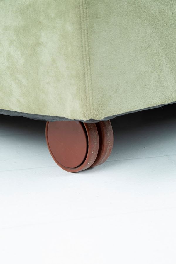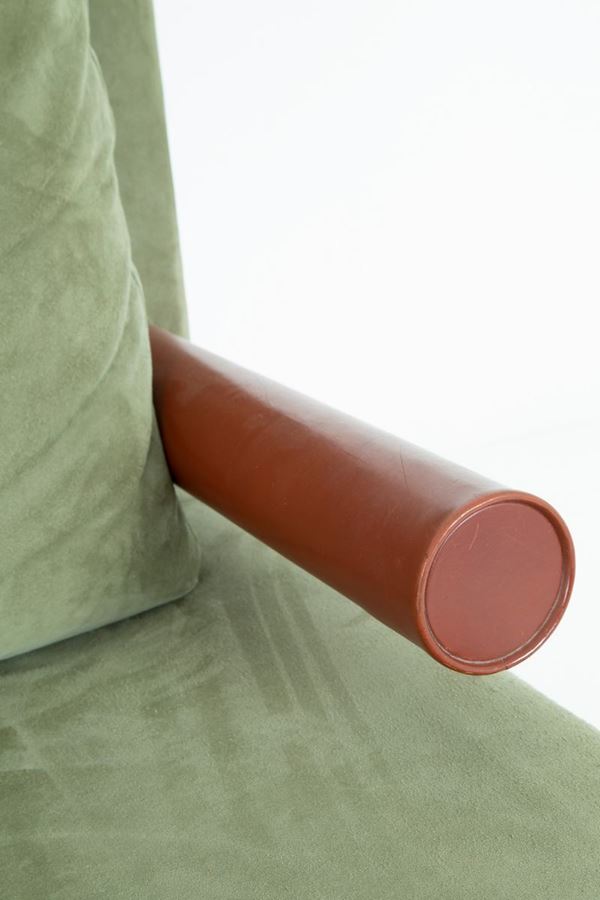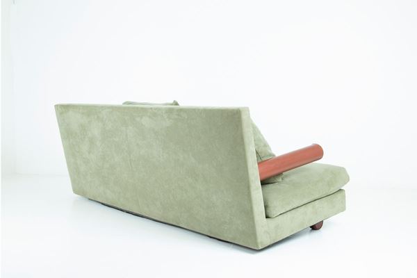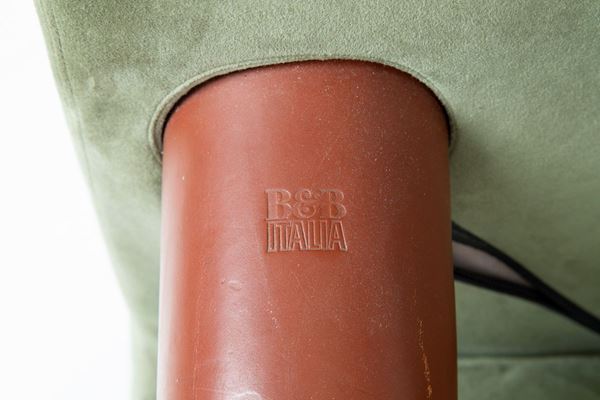 Divano tre posti modello Baisity in alcantara. Produzione B&B ITALIA. Con marchio della manifattura impresso e difetto sul bracciolo. Anni '80.