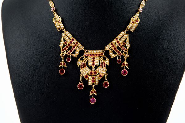 Collana in oro giallo, perle naturali e rubini sintetici, gr. 29,10 ca. Epoca 1880.