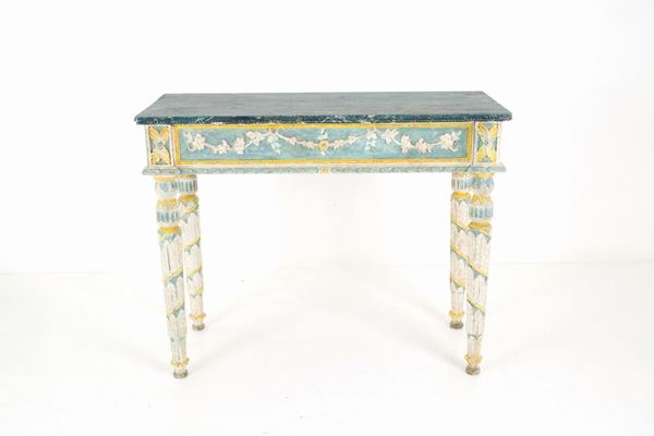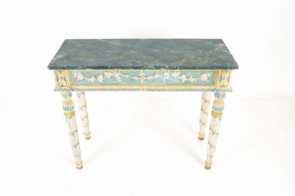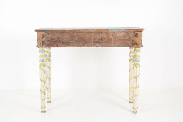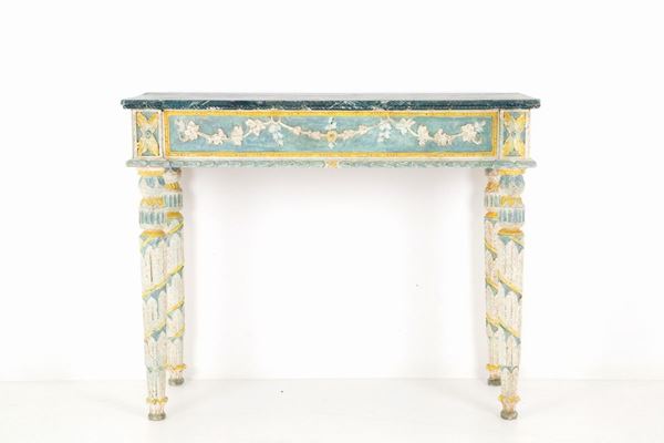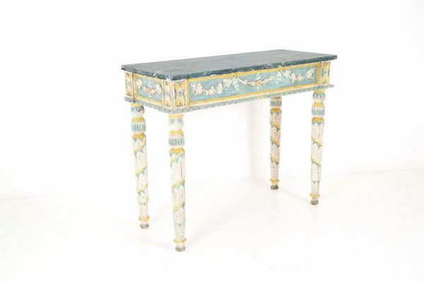 Consolle in legno intagliato e laccato con piano a finto marmo. Piemonte. Difetti.