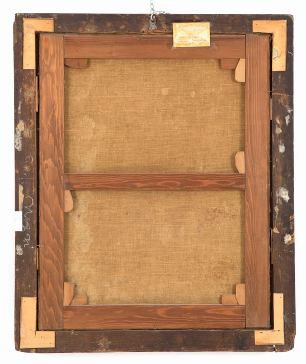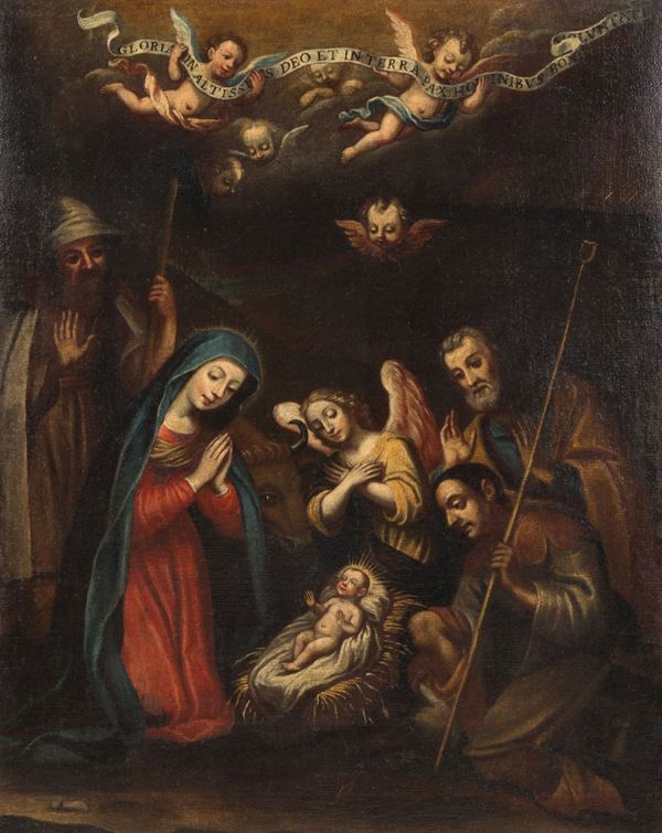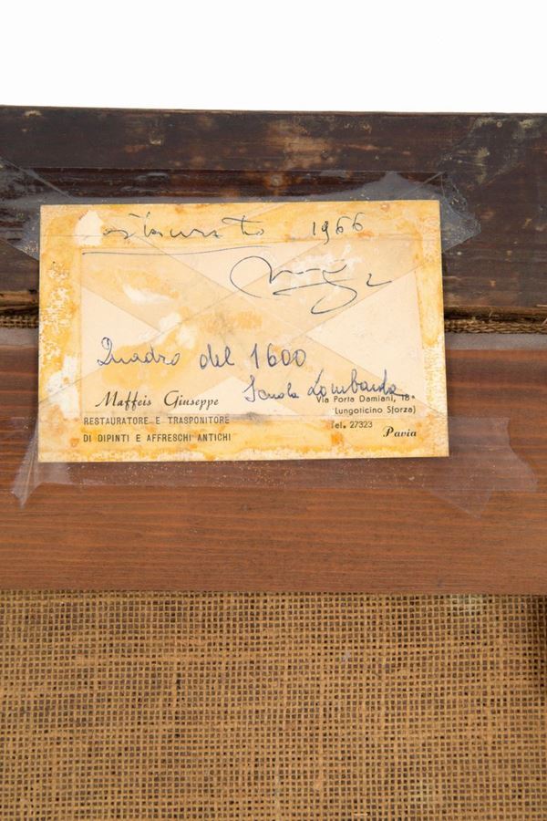 SCUOLA LOMBARDA DEL XVII SECOLO. Dipinto olio su tela "ADORAZIONE DEI PASTORI". In cornice coeva. Restauri. Già rintelato e rintelaiato.