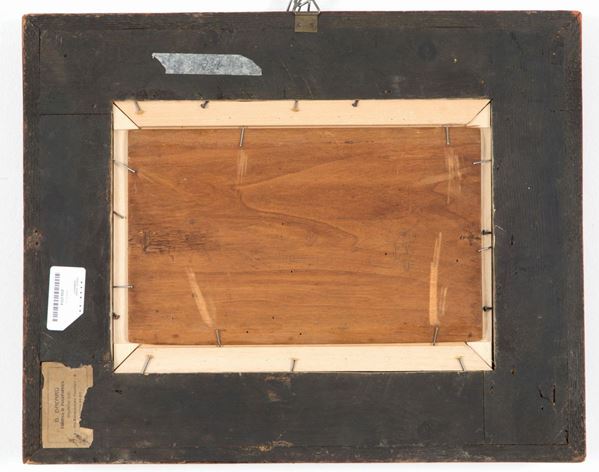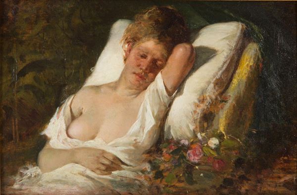 Dipinto olio su tavola raffigurante "DONNA DORMIENTE". Fine XIX secolo. In cornice intagliata, dorata e laccata.
