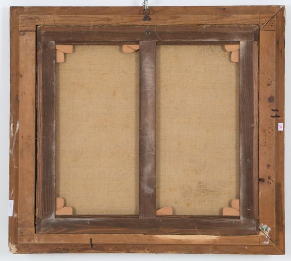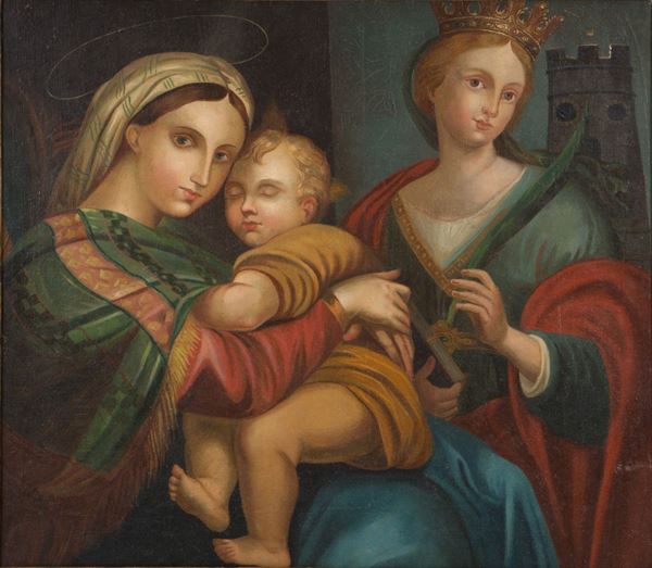 Dipinto olio su tela raffigurante "MADONNA DELLA SEGGIOLA E SANTA BARBARA". XIX secolo. In cornice.
