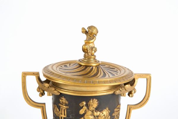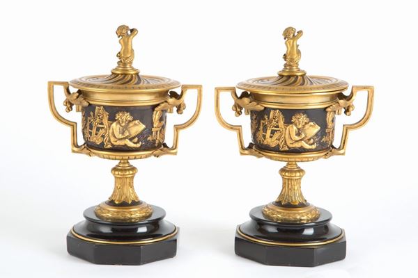 Due coppe con coperchio in bronzo dorato su base in marmo nero del Belgio. Inizi XX secolo.