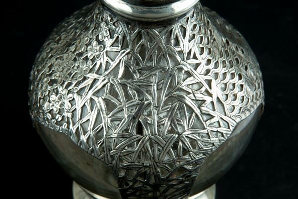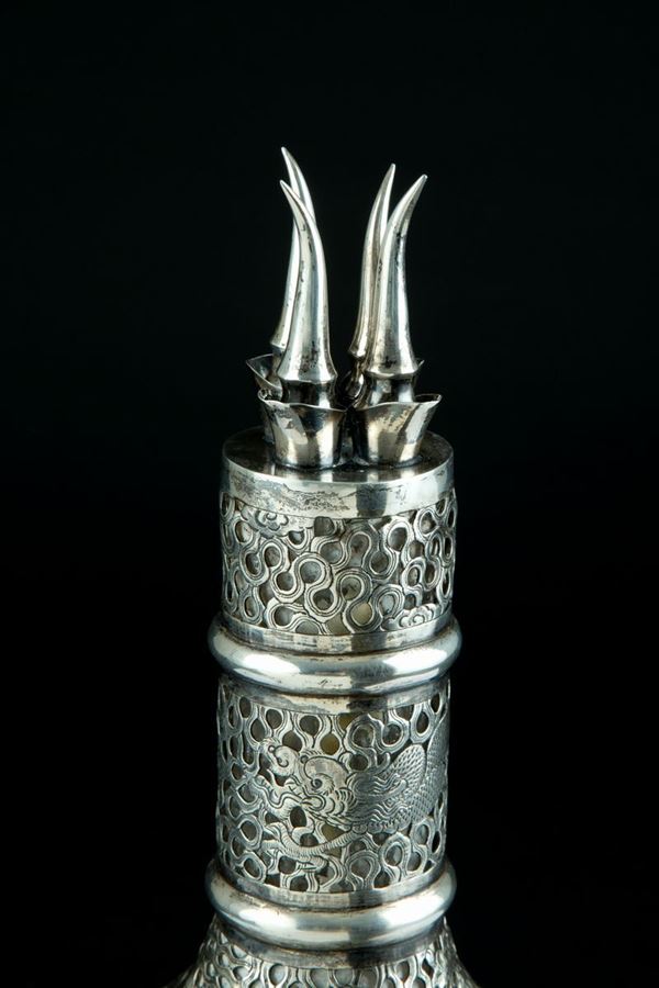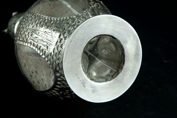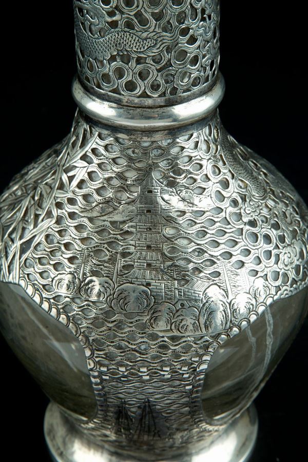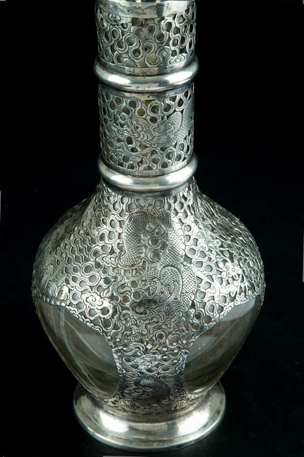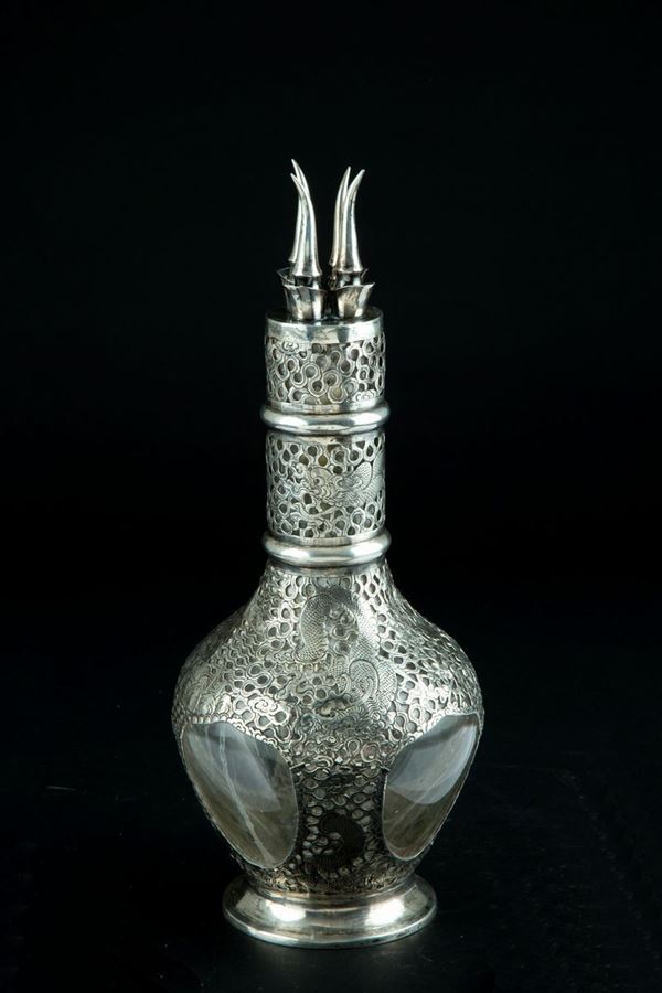 Elegante bottiglia in vetro rivestita in argento cesellato raffigurante "DRAGO E CITTA'" con quattro tappi a corno in argento. Marchio sterling e timbri sul fondo. Cina.