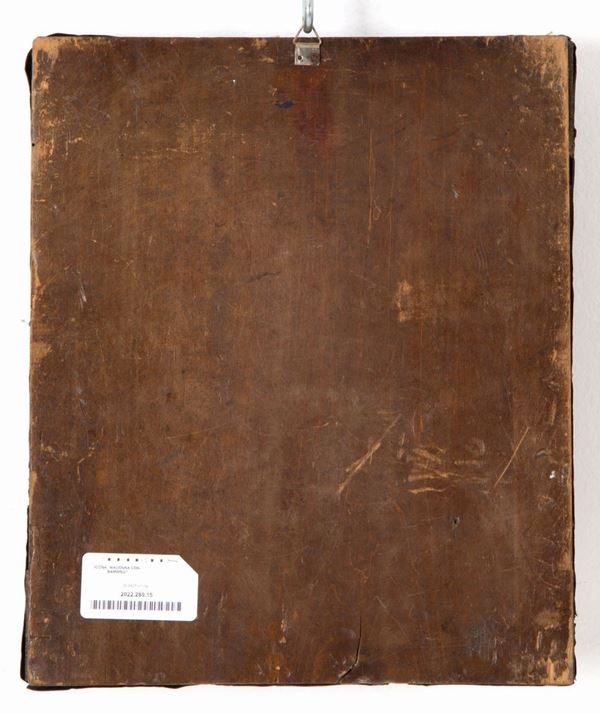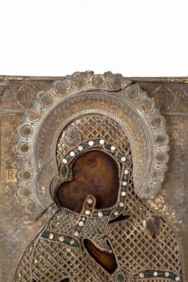 Icona con riza in argento con perline di fiume e pietre dure raffigurante "MADONNA CON BAMBINO". Russia. Fine XVIII secolo. Difetti.