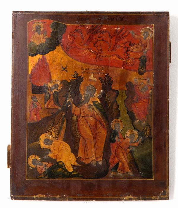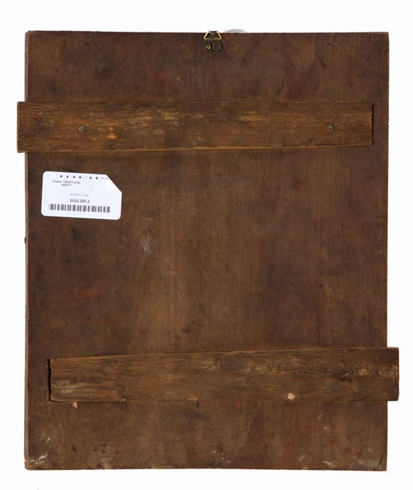 Icona con riza in rame sbalzato e dorato raffigurante "CRISTO CON ANGELI". Russia. XVIII secolo. Difetti.