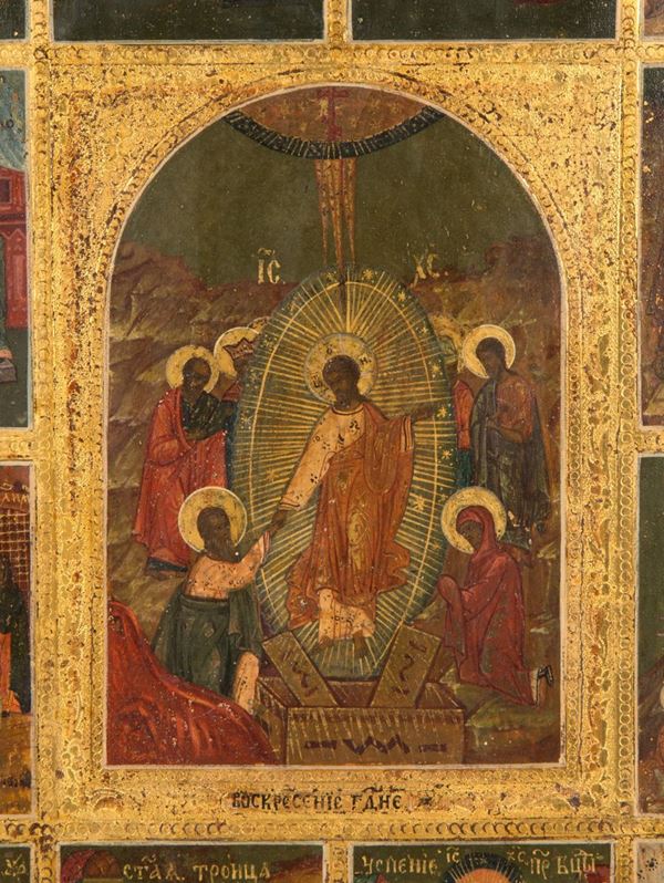 Icona raffigurante "LE DODICI GRANDI FESTE". Russia. XIX secolo. Difetti.