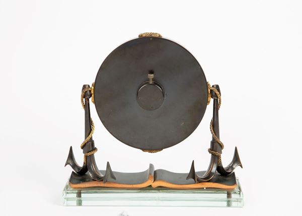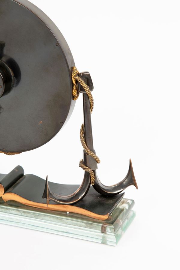 Orologio in rame brunito su base di vetro. Sorretto da due ancore. Anni '20.