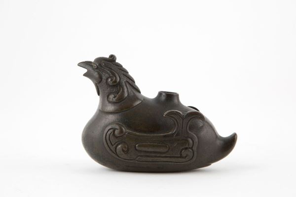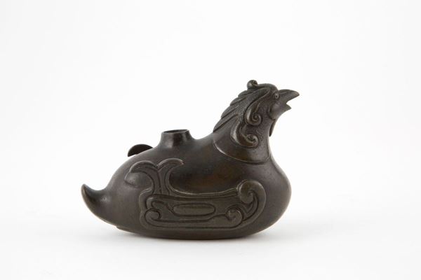 Piccola lucerna in bronzo raffigurante "UCCELLO DI FORMA ARCAICA". Cina.