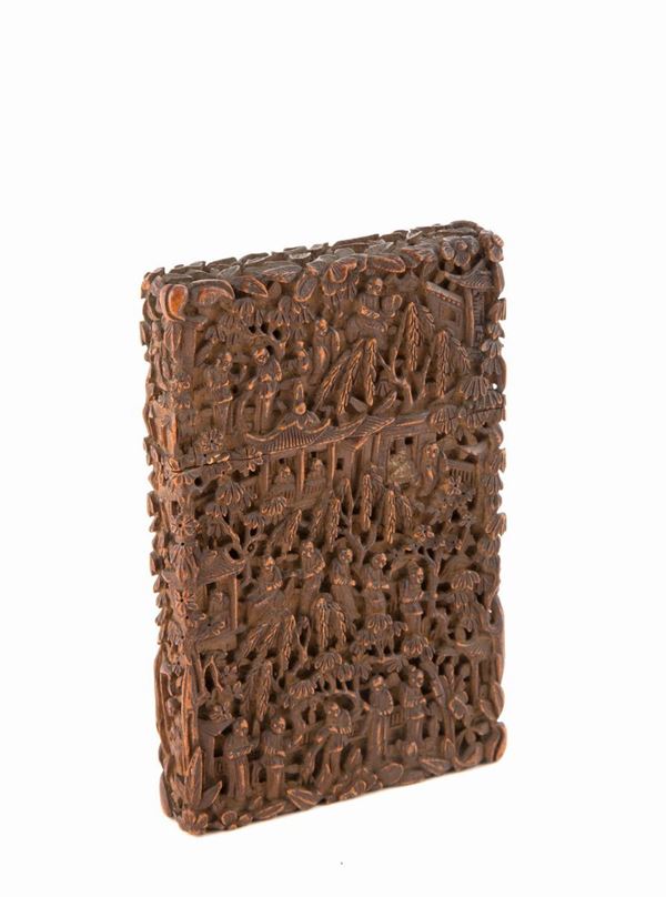 Porta biglietti in legno finemente intagliato con scene di vita. Cina.