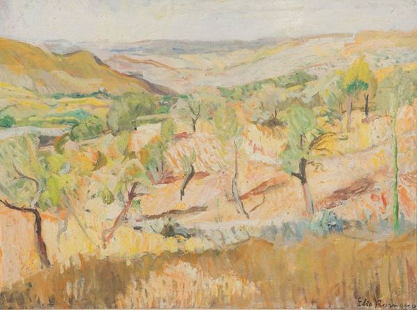 Dipinto olio su tela raffigurante "PAESAGGIO COLLINARE". Firmato in basso a destra. In cornice.