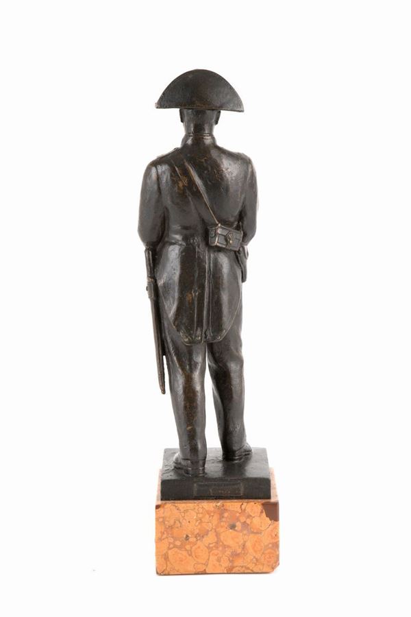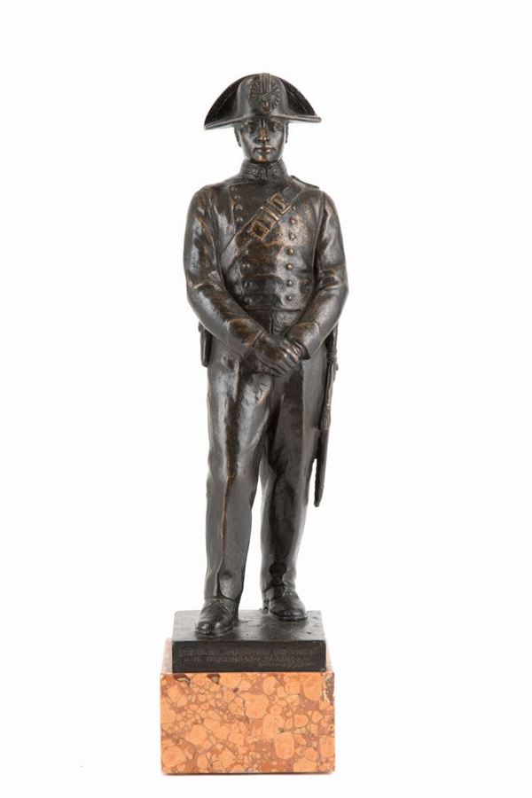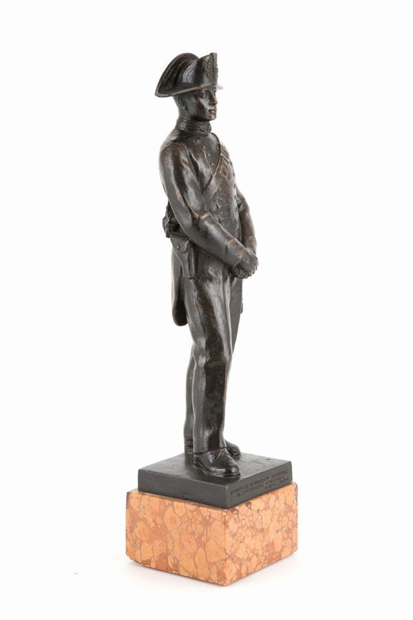 Scultura in bronzo raffigurante "CARABINIERE" su base in marmo. Con incisione sulla base "Statua del monumento nazionale - al carabiniere - Torino - Scultore E. Rubino".  Marchio fonderia Laganà Napoli sul retro.