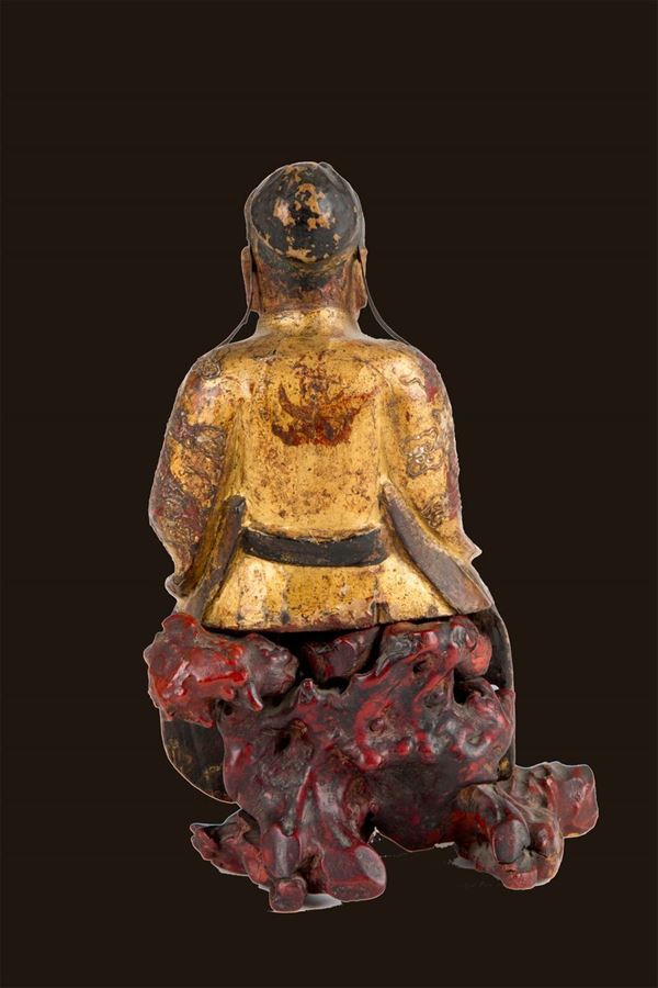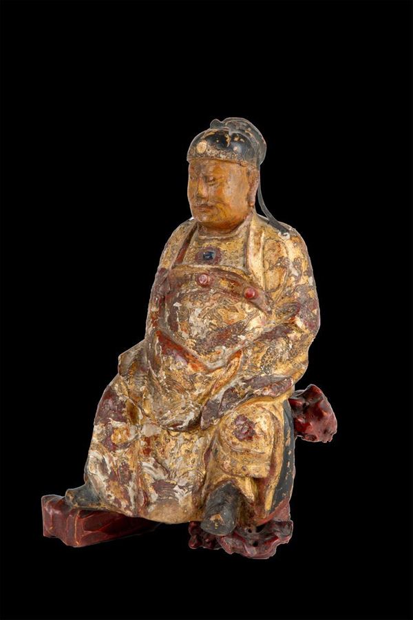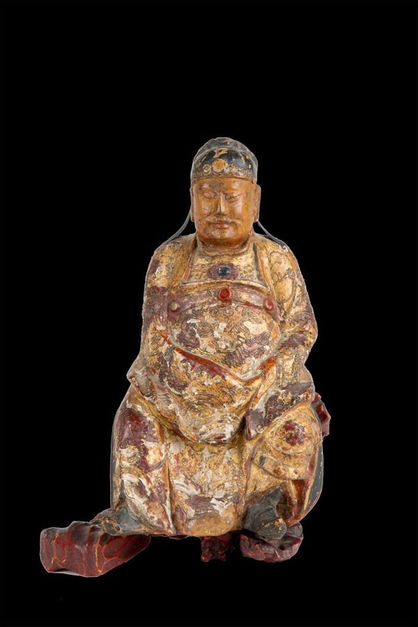 Scultura in legno intagliato e dorato raffigurante "DIVINITA' ". Base in legno. Cina.